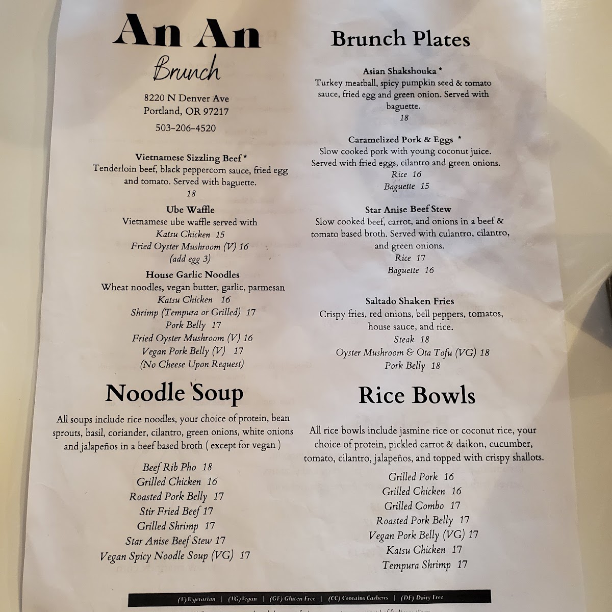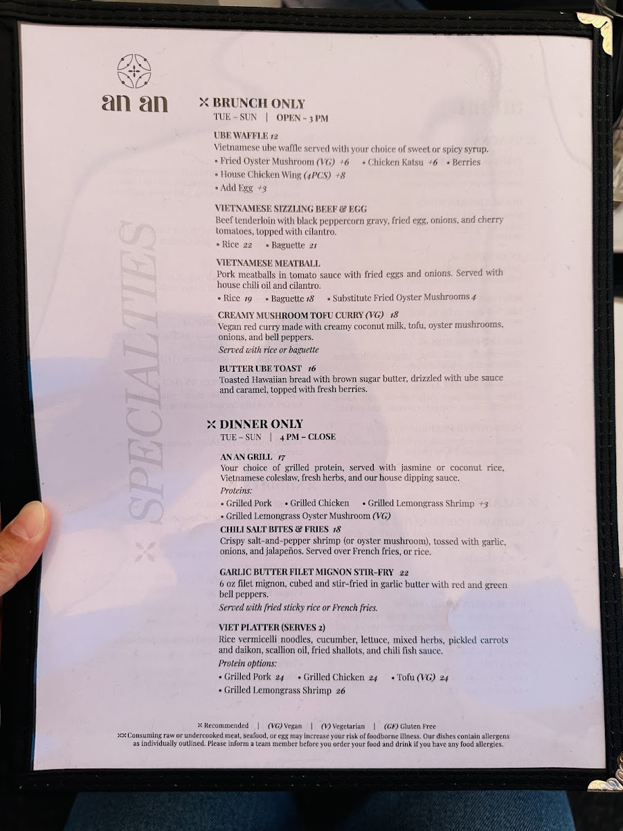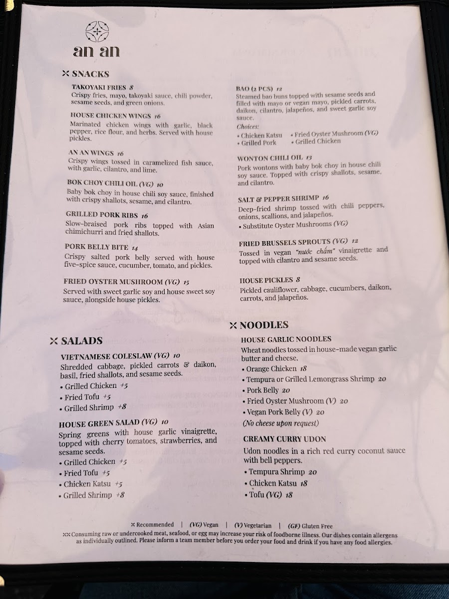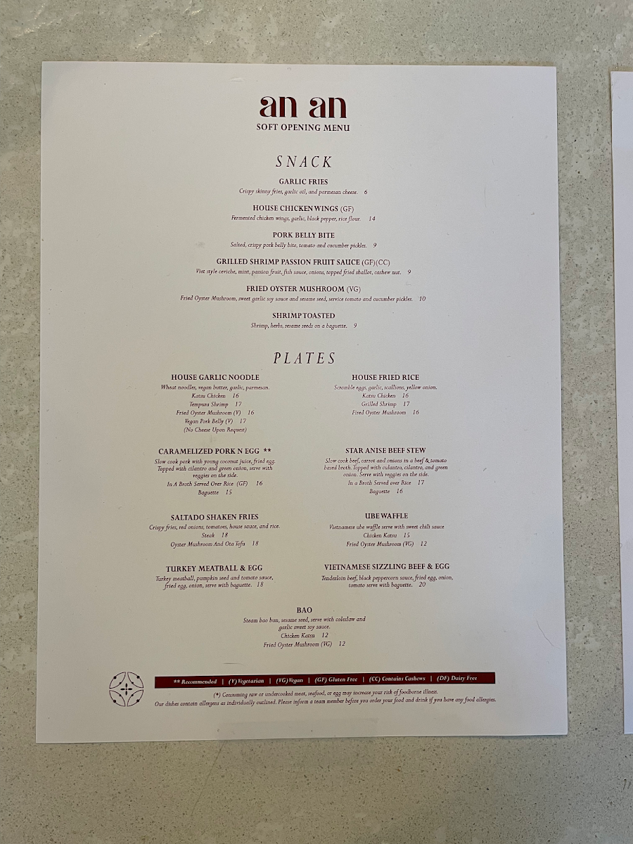 The menu at An An offers a thoughtful blend of Asian-inspired dishes that feel both familiar and inviting, perfect for casual gatherings or a relaxed brunch. With an emphasis on comforting plates like the Vietnamese sizzling beef and house garlic noodles, the food invites you to savor rich, balanced flavors without overwhelming intensity.